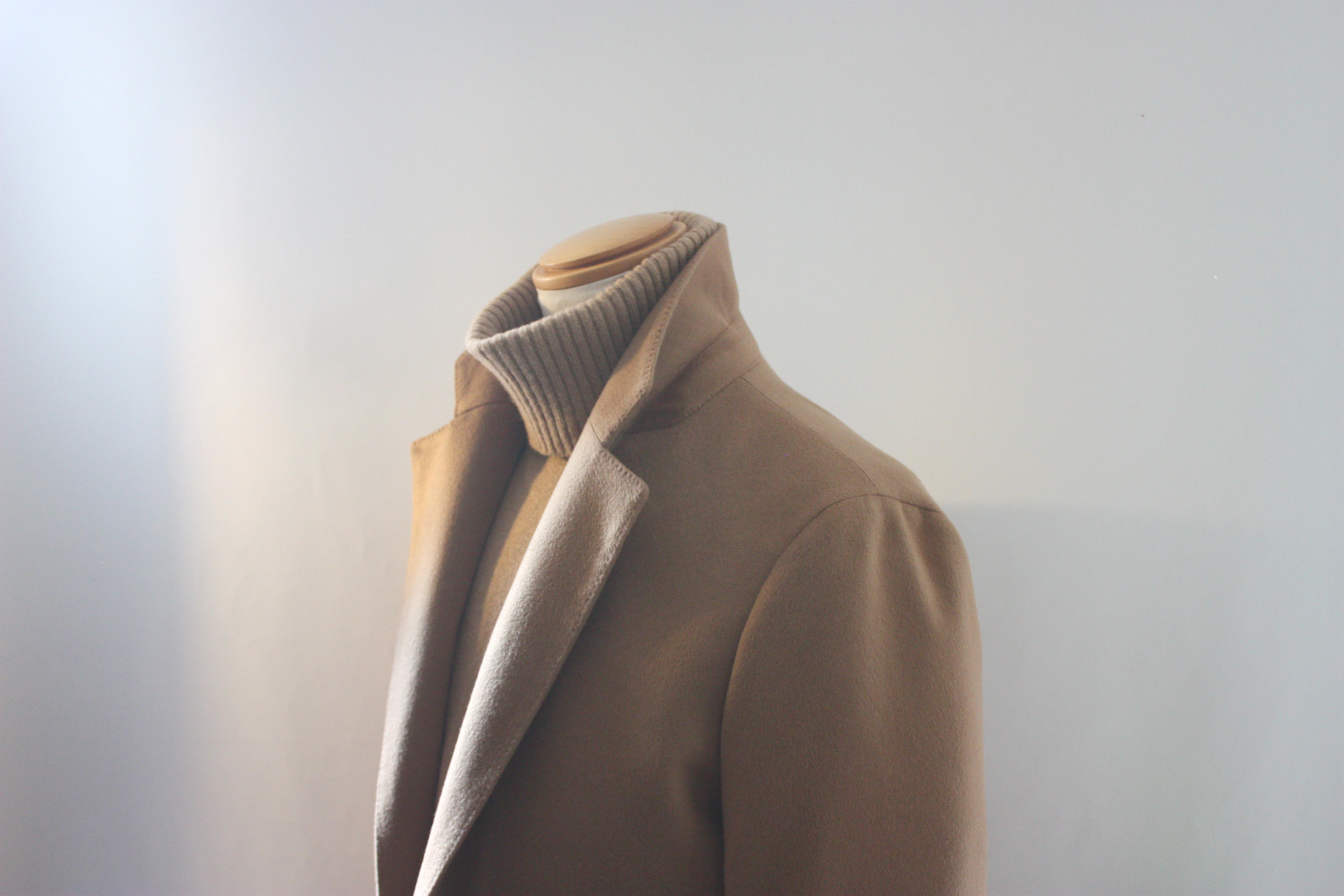 特筆すべきは、肩パッドなし、芯なし、裏地なし、副資材を極限まで省いたとても軽やかな仕立てだということ。軽やかな仕立てにする事で女性にもオーダーしていただけるジェンダーレスなコートに仕上がっています。